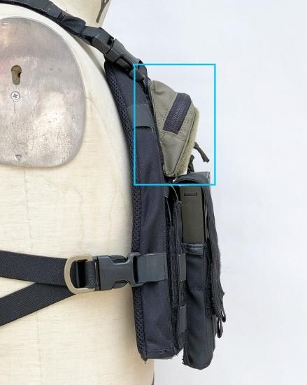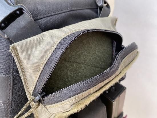 ポーチの固定はベルクロフックで張り付ける方式となっており、胸部にモールがレイアウトされていないタイプのプレートキャリアなどにも使用できます。